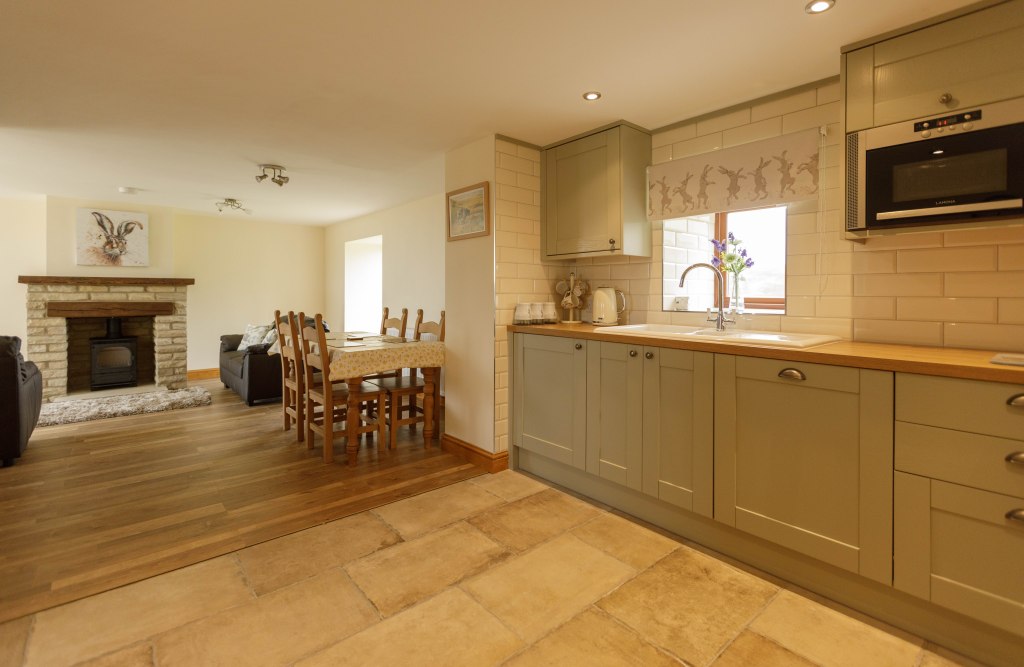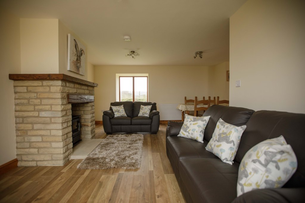 The ground floor living/dining area of this cottage is an open plan design. What once was a large barn door, the entrance to the barn is now a fully glass fronted window which looks into the Courtyard and The Croft. On the adjacent side of the living/dining area is another large window which overlooks the Bord Hill Moor.